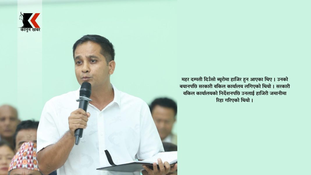महर दम्पती दिउँसो ब्युरोमा हाजिर हुन आएका थिए । उनको बयानपछि सरकारी वकिल कार्यालय लगिएको थियो । सरकारी वकिल कार्यालयको निर्देशनपछि उनलाई हाजिरी जमानीमा रिहा गरिएको थियो ।