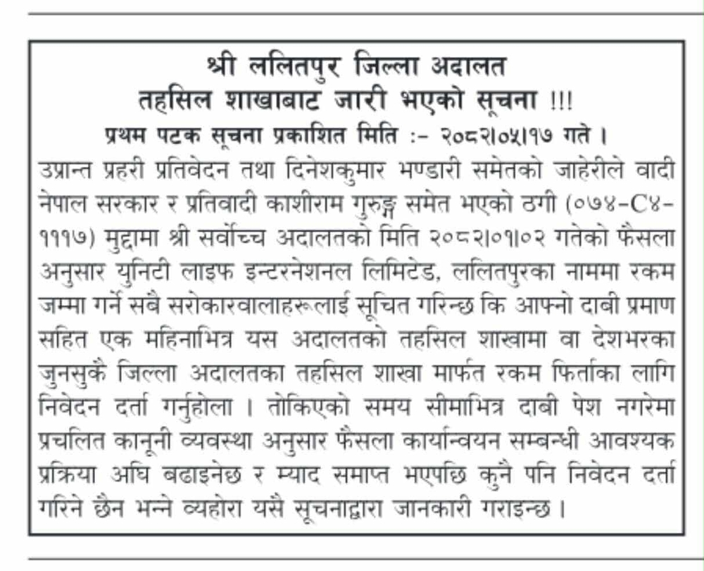 सर्वोच्च अदालतको आदेश कार्यान्वयनका लागि पीडितहरूलाई प्रमाणसहित रकम दाबी गर्न ललितपुर जिल्ला अदालतले २०६२ सालदेखि सुरु भएको युनिटी लाइफ ठगी प्रकरणमा २०८२ सालमा फैसला कार्यान्वयनको प्रक्रिया अघि बढाएको हो।