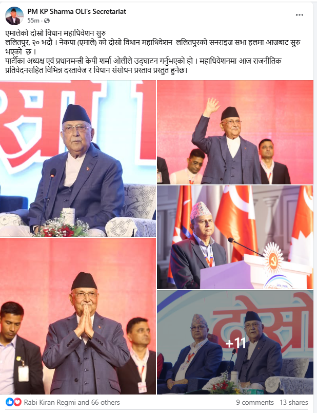 ललितपुर । सरकारले फेसबुकसहित दर्ता नभएका सामाजिक सञ्जाल बन्द गर्ने निर्णय गरेर आम नागरिकलाई नियन्त्रणमा राखेको छ । तर यही समयमा प्रधानमन्त्री केपी शर्मा ओलीको सचिवालयले भने फेसबुकमार्फत एमालेको दोस्रो विधान महाधिवेशनसम्बन्धी फोटो र प्रचार सामग्री सार्वजनिक गरिरहेको छ ।
