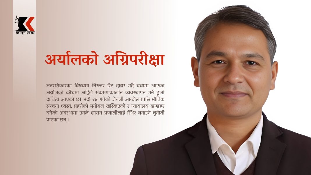 जनसरोकारका विषयमा निरन्तर रिट दायर गर्दै चर्चामा आएका अर्यालको काँधमा अहिले संक्रमणकालीन व्यवस्थापन गर्ने ठूलो दायित्व आएको छ। भदौ २४ गतेको जेनजी आन्दोलनपछि भौतिक संरचना ध्वस्त, प्रहरीको मनोबल खस्किएको र न्यायालय खण्डहर बनेको अवस्थामा उनले शासन प्रणालीलाई स्थिर बनाउने चुनौती पाएका छन्।
