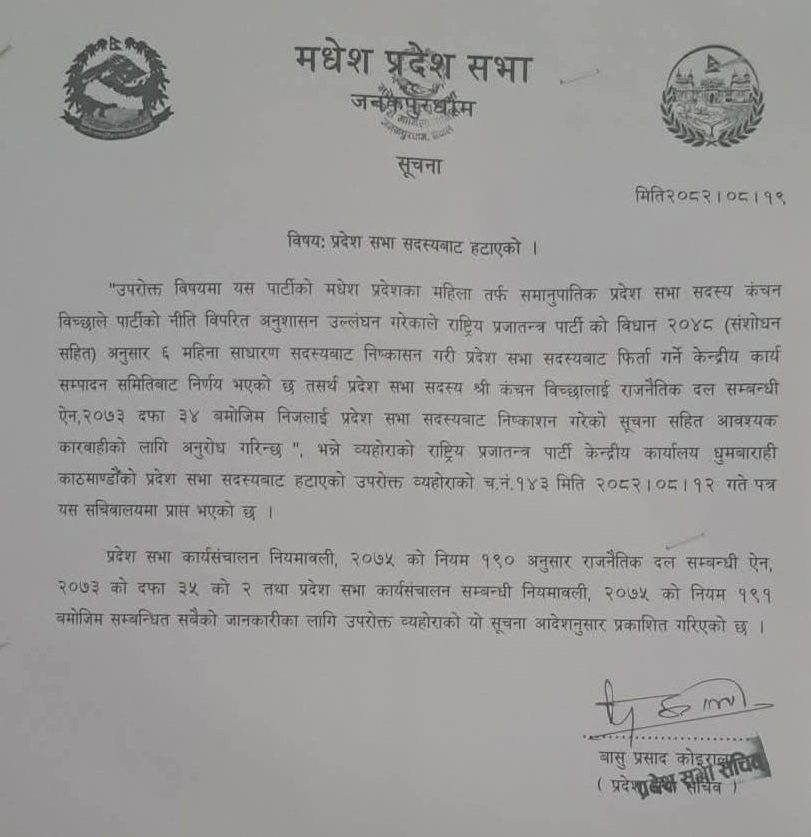 काठमाडौं । राष्ट्रिय प्रजातन्त्र पार्टी (राप्रपा) मधेस प्रदेशकी समानुपातिक सांसद कंचन विच्छा पदमुक्त भएकी छन्। पार्टीको आन्तरिक निर्णय प्रदेश सचिवालयमा दर्ता भएपछि शुक्रबार उनको पद खारेज गरिएको सूचना प्रदेश सभाले सार्वजनिक गरेको हो।