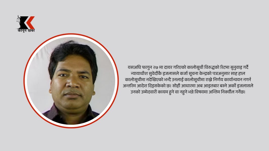 काठमाडौँ । धनुषा निर्वाचन क्षेत्र नम्बर १ मा राष्ट्रिय स्वतन्त्र पार्टी (रास्वपा) का उम्मेदवार किशोरी साह ‘कमल’ को उम्मेदवारी खारेजी सम्बन्धी विवादमा सर्वोच्च अदालतले नयाँ आदेश जारी गरेको छ। शुक्रबार न्यायाधीश शारंगा सुवेदी र टेकप्रसाद ढुंगानाको संयुक्त इजलासमा परेको उक्त रिट ‘हेर्न नमिल्ने’ सूचीमा परेपछि अब यसको छिनोफानो आगामी आइतबार हुने भएको छ।