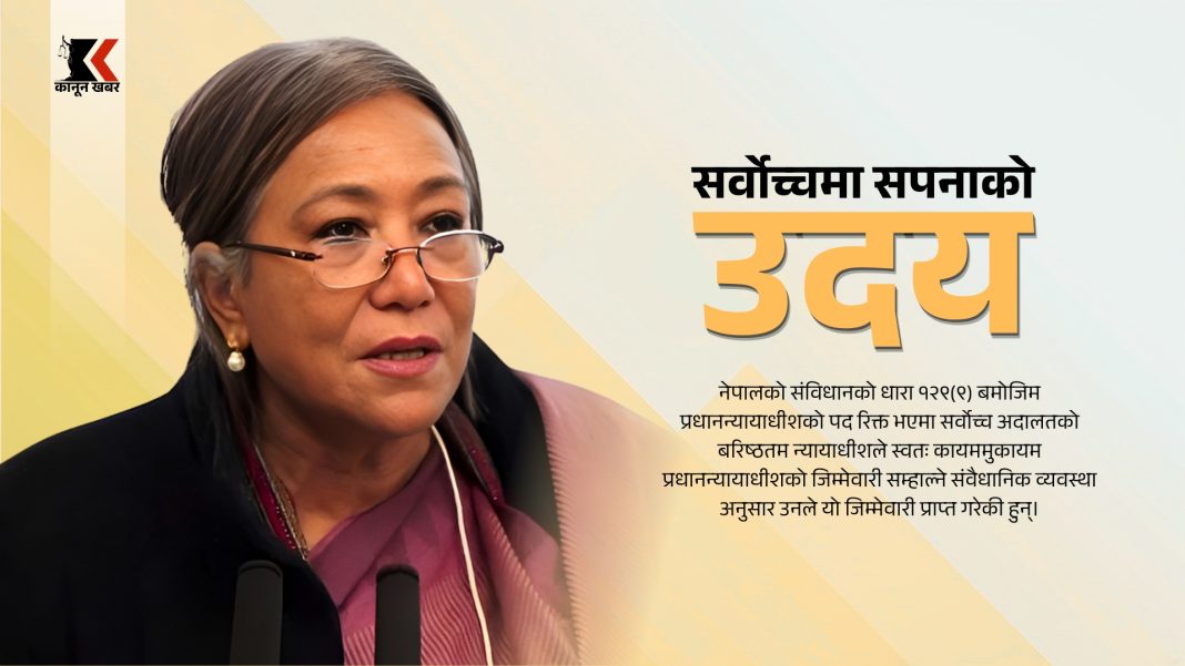 काठमाडौं । प्रधानन्यायाधीश प्रकाशमानसिंह राउत ६५ वर्षे उमेरहदका कारण मंगलबारबाट सेवानिवृत्त भएपछि सर्वोच्च अदालतको बरिष्ठतम न्यायाधीश सपना प्रधान मल्लले आजदेखि कायममुकायम (कामु) प्रधानन्यायाधीशको कार्यभार सम्हालेकी छन्। नेपालको संविधानको धारा १२९(९) बमोजिम प्रधानन्यायाधीशको पद रिक्त भएमा सर्वोच्च अदालतको बरिष्ठतम न्यायाधीशले स्वतः कायममुकायम प्रधानन्यायाधीशको जिम्मेवारी सम्हाल्ने संवैधानिक व्यवस्था अनुसार उनले यो जिम्मेवारी प्राप्त गरेकी हुन्।