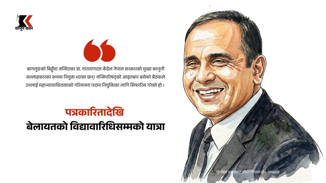 काठमाडौं । बागलुङका डा. नारायणदत्त कँडेल नेपाल सरकारको मुख्य कानुनी सल्लाहकारको रूपमा नियुक्त भएका छन्। मन्त्रिपरिषद्को आइतबारको बैठकले उनलाई महान्यायाधिवक्तामा नियुक्तिका लागि सिफारिस गरेको हो। २००७ मा नेसनल युनिभर्सिटी अफ आयरल्याण्डबाट अन्तर्राष्ट्रिय शान्ति अध्ययन र २००९ मा बेलायतको अलस्टर युनिभर्सिटीबाट कानुनमा स्नातकोत्तर गरेर पछि बेलायतबाट विद्यावारिधि गरेका कँडेलको परिचय अहिले कानूनविद्का रूपमा रहे पनि उनको व्यावसायिक जग भने पत्रकारिताले निर्माण गरेको हो।