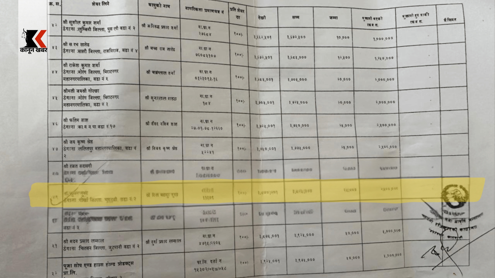 काठमाडौँ । पारदर्शिता र सुशासनको नारा घन्काउँदै सत्ताको बागडोर सम्हालेका गृहमन्त्री सुधन गुरुङ विवादको घेरामा तानिएका छन्। हालै सार्वजनिक भएको उनको सम्पत्ति विवरणमा एक ‘विवादास्पद’ कम्पनीको ठुलो हिस्सा सेयर लुकाएको तथ्य फेला परेको छ।