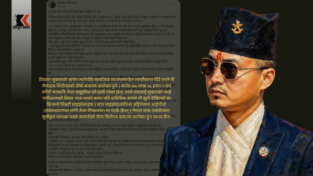 कम्पनी रजिस्ट्रारको कार्यालयको अभिलेख अनुसार गुरुङको नाममा यी दुई कम्पनीमा २५–२५ हजार कित्ता संस्थापक सेयर रहेको देखिन्छ, जसको प्रतिसेयर अंकित मूल्य १ सय रुपैयाँ रहेको छ। तर, मन्त्री गुरुङले मन्त्रिपरिषद्मा पेस गरेको विवरणमा यी कम्पनीहरूको नाम उल्लेख गरेका छैनन्। विवरण लुकाएको आरोप लागेपछि सामाजिक सञ्जालमार्फत स्पष्टीकरण दिँदै उनले ती सेयरहरू धितोपत्रको दोस्रो बजारमा कारोबार हुने २ करोड ७४ लाख ५६ हजार २ सय रुपैयाँ बराबरकै सेयर समूहभित्र पर्ने दाबी गरेका छन्। उनले यसलाई लुकाएको नभई ‘वर्गीकरणको विषय’ मात्र भएको बताए पनि प्राविधिक रूपमा यो झुटो देखिएको छ। किनभने लिबर्टी माइक्रोलाइफ र स्टार माइक्रोइन्स्योरेन्स अहिलेसम्म आईपीओ (सर्वसाधारणका लागि सेयर निष्कासन) मा गएकै छैनन् र नेपाल स्टक एक्स्चेन्जमा सूचीकृत नभएका यस्ता कम्पनीको सेयर धितोपत्र बजारमा कारोबार हुन सम्भव छैन।