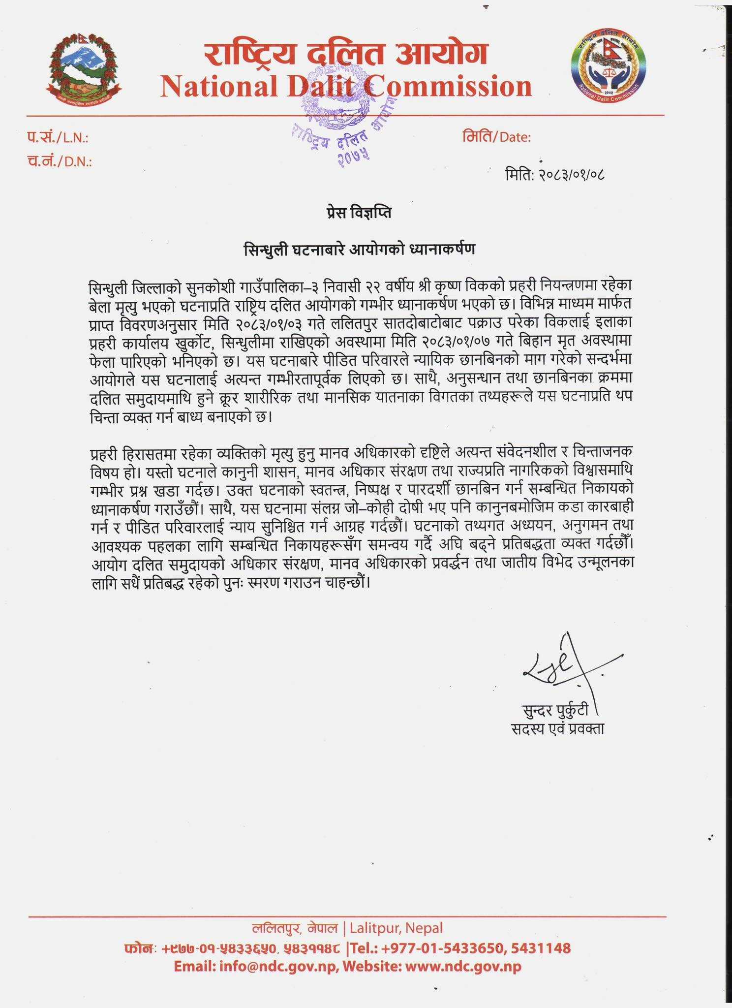 यस घटनाप्रति राष्ट्रिय दलित आयोगले कडा आपत्ति जनाउँदै सरकारको ध्यानाकर्षण गराएको छ। आयोगका प्रवक्ता सुन्दर पुर्कुटीले विज्ञप्ति जारी गर्दै हिरासतमा रहेका व्यक्तिको मृत्यु हुनु मानव अधिकारको दृष्टिले अत्यन्त संवेदनशील र चिन्ताजनक विषय भएको भन्दै निष्पक्ष र पारदर्शी छानबिनको माग गरेका छन्। दलित समुदायमाथि हुने क्रूर शारीरिक तथा मानसिक यातनाका विगतका तथ्यहरूले यस घटनालाई थप शंकास्पद बनाएको आयोगको ठहर छ।