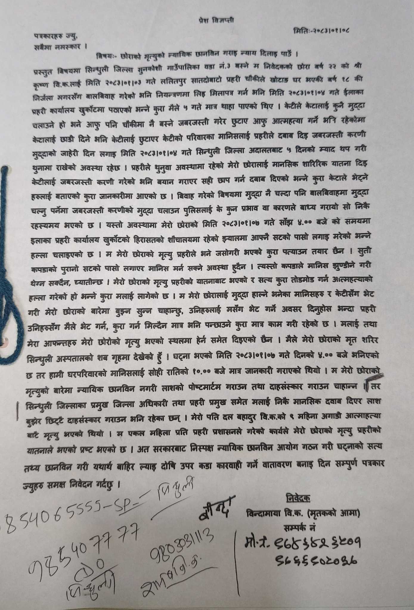 काठमाडौँ। अन्तरजातीय विवाह गरेका कारण पक्राउ परेका एक दलित युवकको सिन्धुलीस्थित इलाका प्रहरी कार्यालय खुर्कोटको हिरासतमा शंकास्पद मृत्यु भएपछि घटनाले उग्र रुप लिएको छ। सुनकोसी गाउँपालिका–३ का २३ वर्षीय श्रीकृष्ण विकको मृत्युलाई प्रहरीले आत्महत्या दाबी गरे पनि पीडित परिवार र अधिकारकर्मीहरूले भने प्रहरीकै मिलेमतोमा हत्या गरिएको गम्भीर आरोप लगाएका छन्।