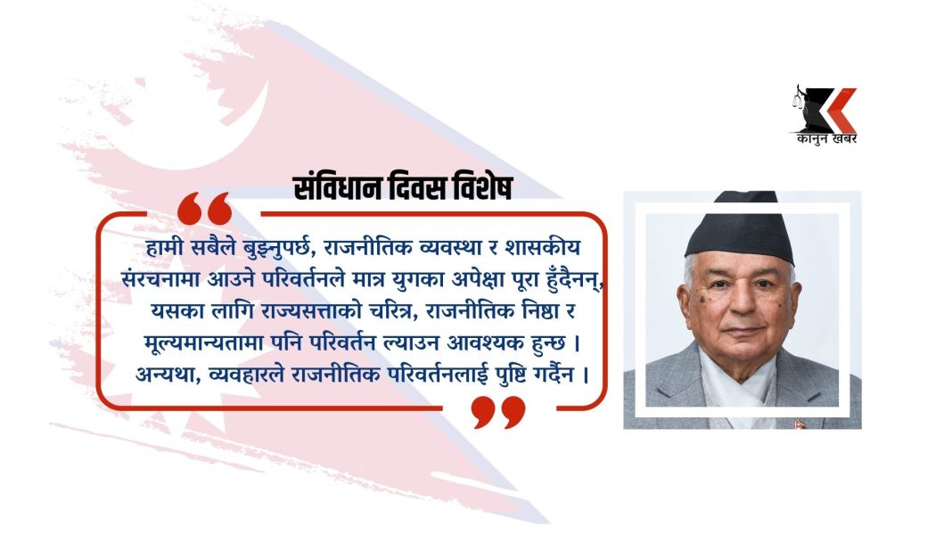 राष्ट्रपति पौडेलले सन्देशमा भन्नुभएको छ, “हामी सबैले बुझ्नुपर्छ, राजनीतिक व्यवस्था र शासकीय संरचनामा आउने परिवर्तनले मात्र युगका अपेक्षा पूरा हुँदैनन्, यसका लागि राज्यसत्ताको चरित्र, राजनीतिक निष्ठा र मूल्यमान्यतामा पनि परिवर्तन ल्याउन आवश्यक हुन्छ । अन्यथा, व्यवहारले राजनीतिक परिवर्तनलाई पुष्टि गर्दैन ।” उहाँले सङ्घीय लोकतान्त्रिक गणतन्त्रात्मक शासन व्यवस्थाको माध्यमद्वारा दिगो शान्ति, सुशासन, विकास र समृद्धिको आकाङ्क्षा पूरा गर्न एकजुट हुन प्रेरणा दिने अपेक्षा गर्नुभएको छ ।