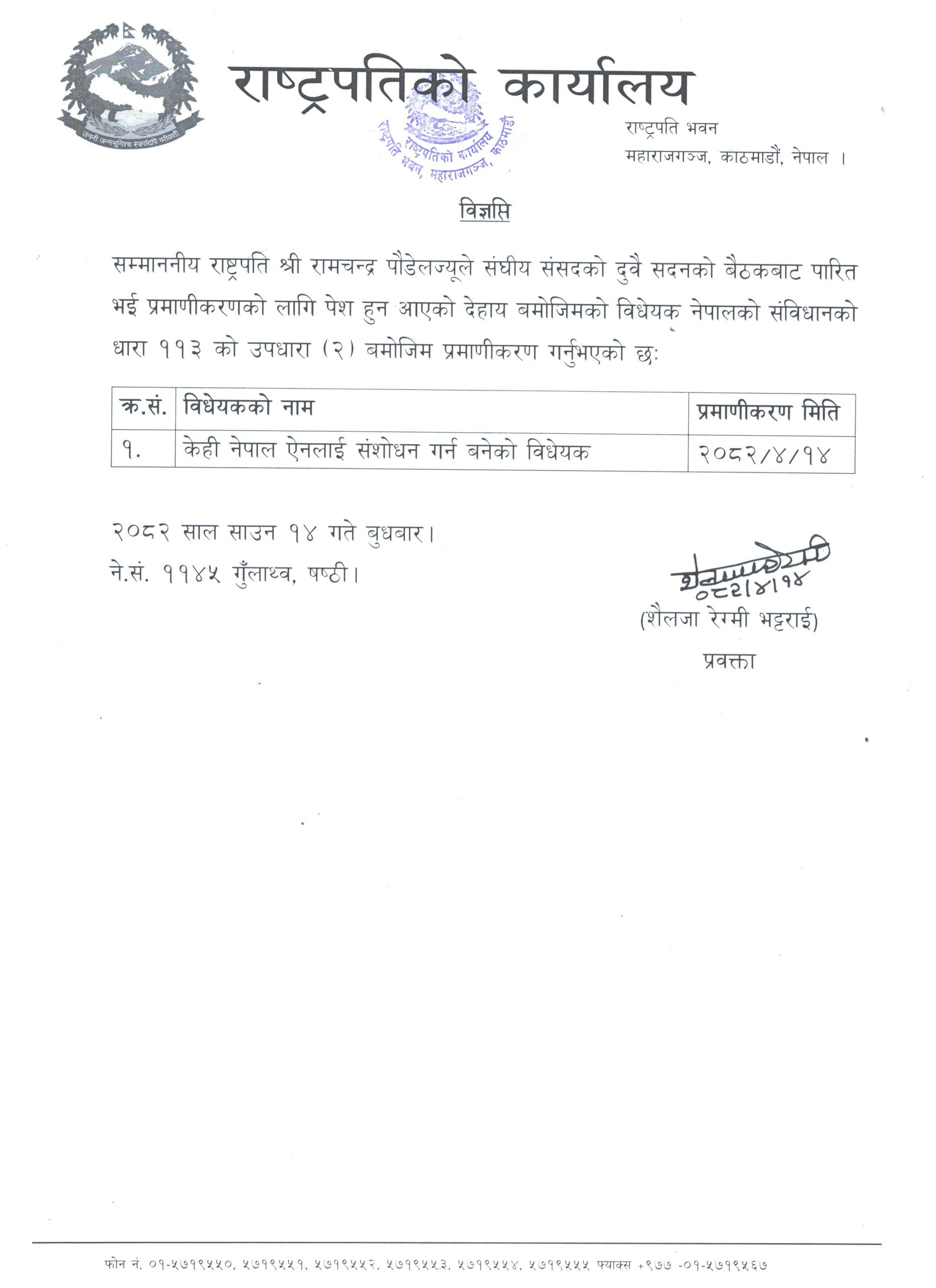 राष्ट्रपति कार्यालयले बुधबार जारी गरेको विज्ञप्तिमा अनुसार, सो विधेयक नेपालको संविधानको धारा ११३ को उपधारा २ बमोजिम प्रमाणीकरण गरिएको हो।