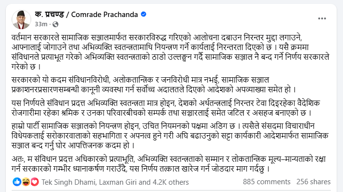 “वर्तमान सरकारले सामाजिक सञ्जालमार्फत सरकारविरुद्ध गरिएको आलोचना दबाउन खोजेको छ,” प्रचण्डले भने, “सामाजिक सञ्जाल नै बन्द गर्ने निर्णय असंवैधानिक र अलोकतान्त्रिक मात्र नभई सर्वोच्च अदालतको आदेशको समेत अपव्याख्या हो ।”