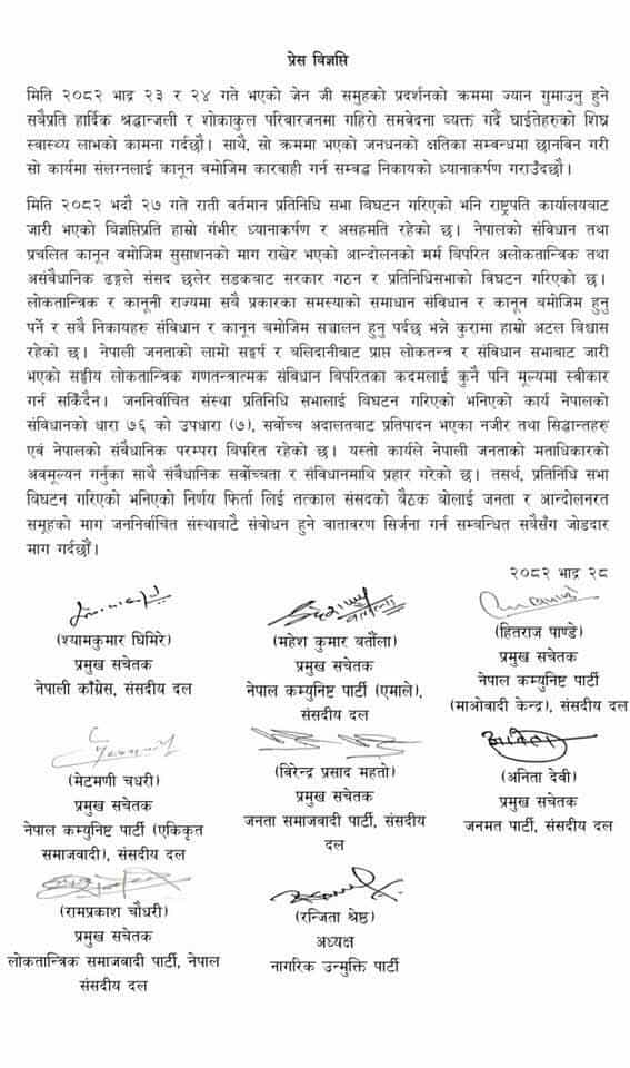 संयुक्त विज्ञप्तिमा नेपाली कांग्रेस, नेकपा (एमाले), नेकपा (माओवादी केन्द्र), नेकपा (एकीकृत समाजवादी), जनता समाजवादी पार्टी (जसपा), जनमत पार्टी, लोकतान्त्रिक समाजवादी पार्टी (लोसपा) र नागरिक उन्मुक्ति पार्टीको हस्ताक्षर छ।
