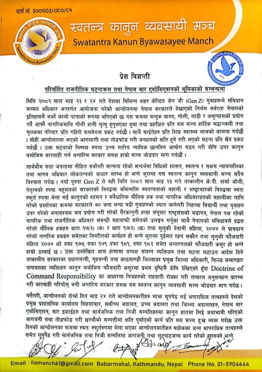 यससँगै मञ्चले नेपाल बार एसोसिएसनको धारणा प्रति असहमति जनाएको छ। यसअघि बारले संसद विघटनलाई असंवैधानिक भन्दै वक्तव्य जारी गरेको थियो। तर मञ्चले भने बार एसोसिएसन सम्पूर्ण कानुन व्यवसायीहरूको प्रतिनिधित्व गर्न असमर्थ रहेको दाबी गरेको छ।