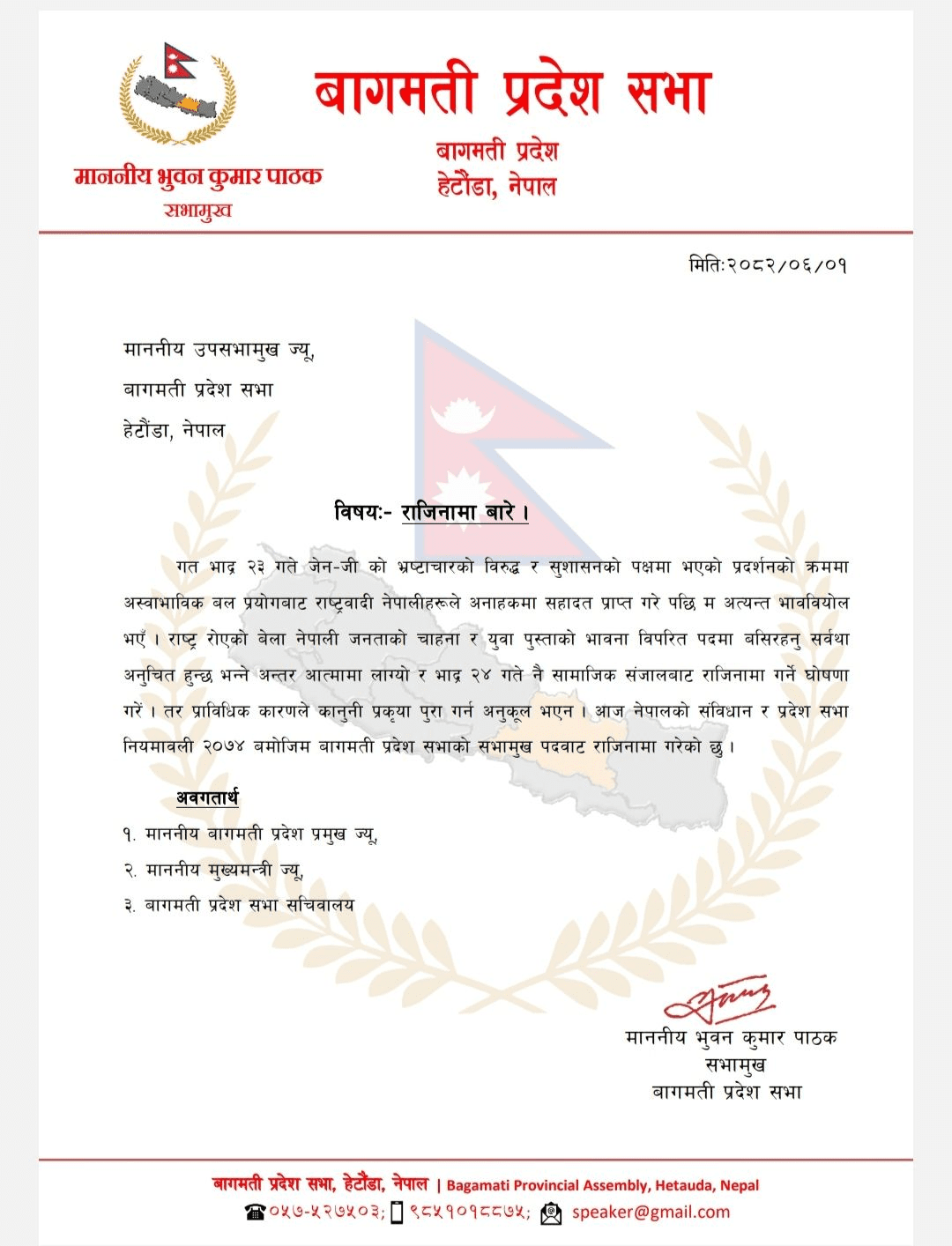 काठमाडौँ । बागमती प्रदेशसभाका सभामुख भुवनकुमार पाठकले आफ्नो पदबाट राजीनामा औपचारिक रूपमा बुझाएका छन्। उनले बुधबार उपसभामुख अप्सरा चापागाईलाई राजीनामापत्र बुझाएका हुन्।