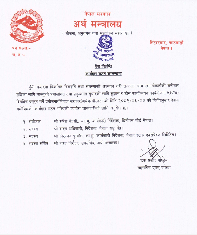 काठमाडौँ । पूँजी बजारमा देखिएका अवरोध तथा लगानीकर्ताको मनोबल घट्दो अवस्थालाई सम्बोधन गर्न सरकारको पहलमा पाँच सदस्यीय कार्यदल गठन गरिएको छ। अर्थ मन्त्रालयको योजना, अनुगमन तथा मूल्यांकन महाशाखाले शुक्रबार विज्ञप्ति जारी गर्दै कार्यदल गठनबारे सार्वजनिक जानकारी दिएको हो।