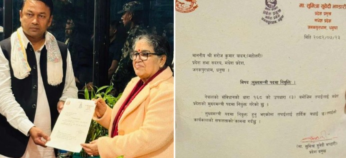 तर लगत्तै प्रदेश प्रमुख भण्डारीले एमाले दलका नेता सरोजकुमार यादवलाई मुख्यमन्त्री नियुक्त गरेको पत्र सार्वजनिक भएको हो ।