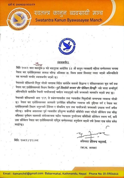 काठमाडौँ । राष्ट्रिय स्वतन्त्र पार्टी रास्वपा निकट स्वतन्त्र कानुन व्यवसायी मञ्चले नेपाल बार एसोसिएसनका अध्यक्ष वरिष्ठ अधिवक्ता डा. विजय प्रसाद मिश्रले हालै व्यक्त गरेको एक विवादास्पद अभिव्यक्तिप्रति आफ्नो गम्भीर ध्यानाकर्षण भएको जनाउँदै कडा आपत्ति प्रकट गरेको छ। मञ्चका कार्यवाहक अध्यक्ष अधिवक्ता हरिचन्द्र भट्टराईद्वारा जारी प्रेस विज्ञप्तिमा, भक्तपुरमा आयोजित ३३ औँ कानुन व्यवसायी महिला सम्मेलनका क्रममा अध्यक्ष मिश्रले दिएको विचारले विधिको शासन र संविधानको मर्ममाथि प्रहार गरेको उल्लेख गरिएको छ।