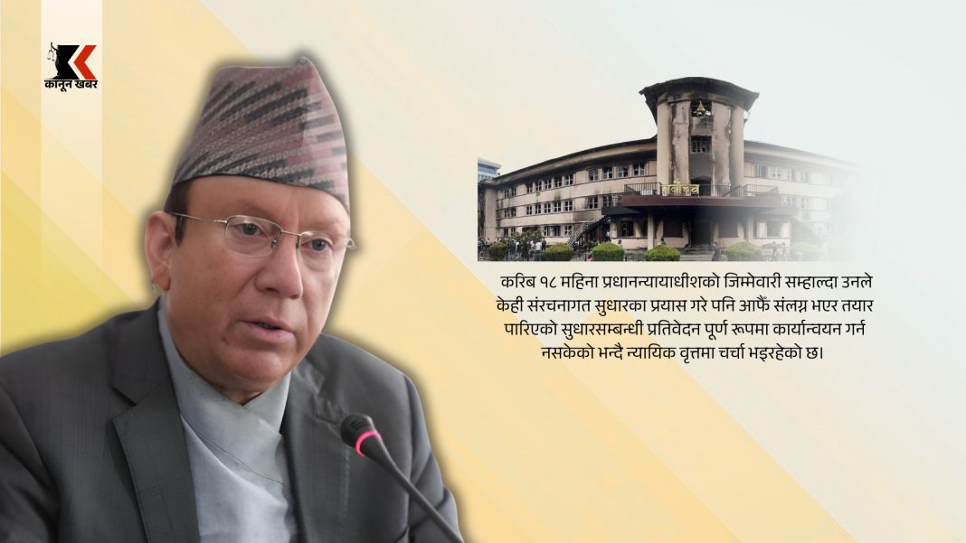 यद्यपि, करिब १८ महिना प्रधानन्यायाधीशको जिम्मेवारी सम्हाल्दा उनले केही संरचनागत सुधारका प्रयास गरे पनि आफैँ संलग्न भएर तयार पारिएको सुधारसम्बन्धी प्रतिवेदन पूर्ण रूपमा कार्यान्वयन गर्न नसकेको भन्दै न्यायिक वृत्तमा चर्चा भइरहेको छ। न्यायालयको शुद्धीकरण गर्ने प्रतिवद्धता व्यक्त गरे पनि महत्वपूर्ण प्रतिवेदनहरू दराजमै थन्किएको अवस्थामा उनी अनिवार्य अवकाशमा जान लागेका हुन्। अब कायममुकायमको जिम्मेवारी सम्हाल्न लागेकी सपना प्रधान मल्ल पनि कानून व्यवसायी पृष्ठभूमिकै हुन्।