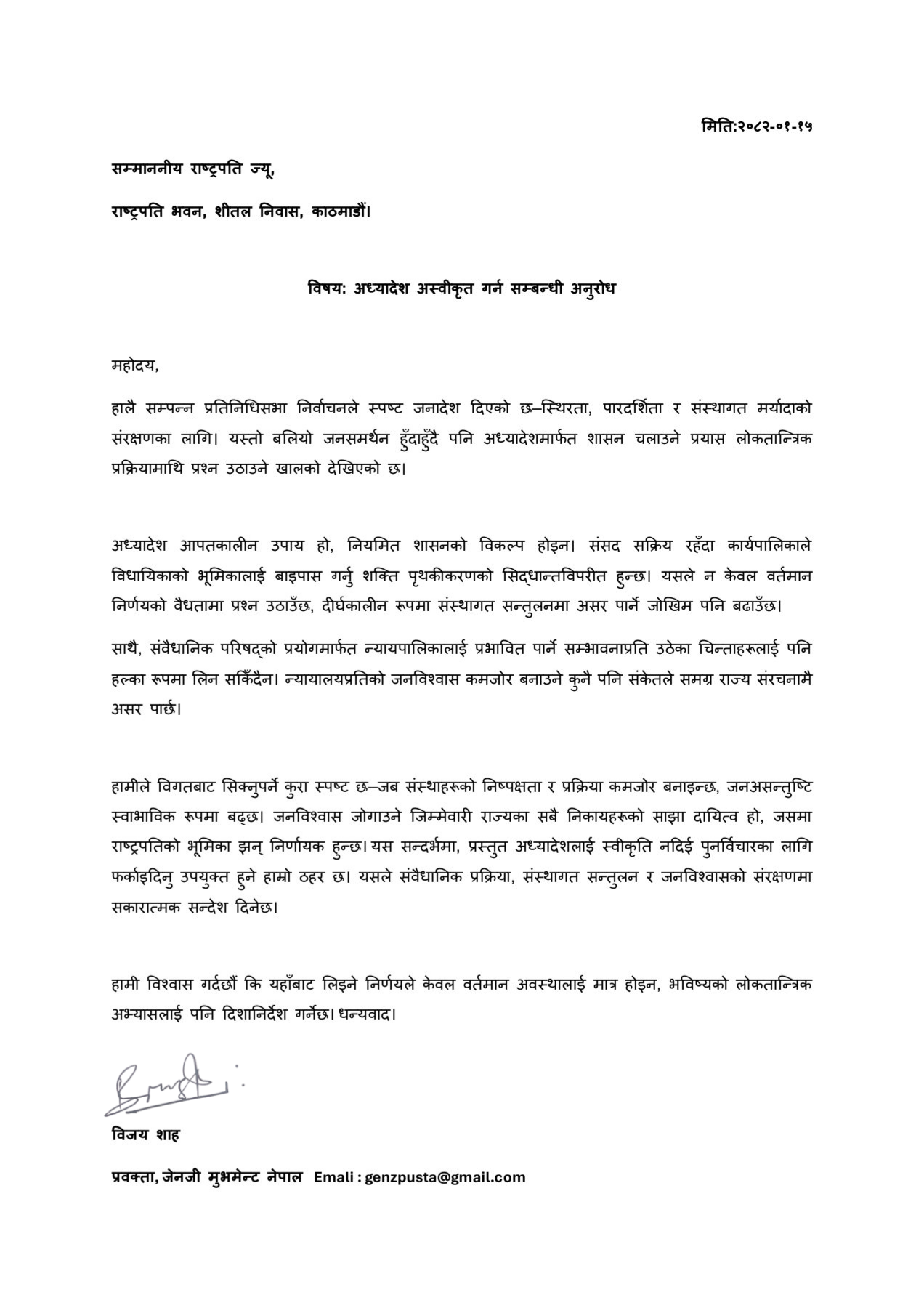प्रवक्ता शाहले पठाएको पत्रमा अध्यादेशलाई आपतकालीन अवस्थामा मात्र प्रयोग गरिने विशेष उपायका रूपमा लिइनुपर्ने र यसलाई नियमित शासन सञ्चालनको विकल्प बनाइनु नहुने उल्लेख गरिएको छ। संसद् सक्रिय रहेको अवस्थामा कार्यपालिकाले विधायिकाको भूमिकालाई बाइपास गरेर अध्यादेश ल्याउनु शक्ति पृथकीकरणको सिद्धान्तविपरीत हुने मुभमेन्टको ठहर छ। यस्तो अभ्यासले वर्तमान निर्णयको वैधतामाथि मात्र प्रश्न नउठाई दीर्घकालीन रूपमा संस्थागत सन्तुलनमा समेत गम्भीर जोखिम निम्त्याउने चेतावनी दिइएको छ।