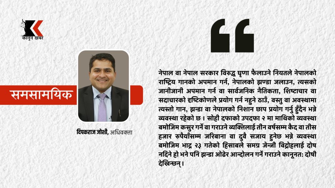 नेपाली झन्डा प्रयोग गरेर देशका भौतिक संरचना जलाउनुलाई राष्ट्रवादी मानिन्छ जस्तो मलाई लाग्दैन । चाहे कानून जानेकै बाट होस चाहे अरू कसैबाट । संरचना हाम्रा सम्पत्ति हुन् । झन्डा ओढेर देशका तीनै अङ्ग जलाइयो । यसलाई झन्डाको सदुपयोग कसरी भन्न सकिन्छ रु हाम्रो देशको झन्डाको इतिहास लामो रहेको छ । हरेक देशको राष्ट्रिय धरोहरको रक्षा गर्नु हरेक नागरिकको दायित्व रहेको हुन्छ । नेपालको संविधान, २०७२ को धारा ८ मा सिम्रिक रङ्गको भुईँ र गाढा नीलो रङ्गको किनारा भएको दुई त्रिकोण अलिकति जोडिएको, माथिल्लो भागमा खुर्पे चन्द्रको बिचमा सोह्रमा आठ कोण देखिने सेतो आकार र तल्लो भागमा बाह्र कोणयुक्त सूर्यको सेतो आकार अङ्कित भएको, परम्परागत झन्डा नेपालको राष्ट्रिय झन्डा हो भनेर परिभाषित गरिएको छ । मुलुकी अपराध संहिता २०७४ को दफा १५१९१० मा कसैले नेपाल वा नेपाल सरकार विरुद्ध घृणा फैलाउने नियतले नेपालको राष्ट्रिय गानको अपमान गर्न, नेपालको झण्डा जलाउन, त्यसको जानीजानी अपमान गर्न वा सार्वजनिक नैतिकता, शिष्टाचार वा सदाचारको दृष्टिकोणले प्रयोग गर्न नहुने ठाउँ, वस्तु वा अवस्थामा त्यस्तो गान, झन्डा वा नेपालको निशान छाप प्रयोग गर्नु हुँदैन भन्ने व्यवस्था रहेको छ । सोही दफाको उपदफा २ मा माथिको व्यवस्था बमोजिम कसुर गर्ने वा गराउने व्यक्तिलाई तीन वर्षसम्म कैद वा तीस हजार रुपैयाँसम्म जरिबाना वा दुवै सजाय हुनेछ भन्ने व्यवस्था बमोजिम भाद्र २३ गतेको हिसाबले समग्र जेन्जी विद्रोहलाई दोष नदिने हो भने पनि झन्डा ओढेर आन्दोलन गर्ने गराउने कानूनत: दोषी देखिन्छन् । किनभने यो जेन्जी आन्दोलनमा घुसपैठ भएर नेपाल सरकार विरुद्ध घृणा फैलाउने नियतले नेपालको झन्डाको दुरुपयोग गर्नु भएको प्रस्टै देखिन्छ ।