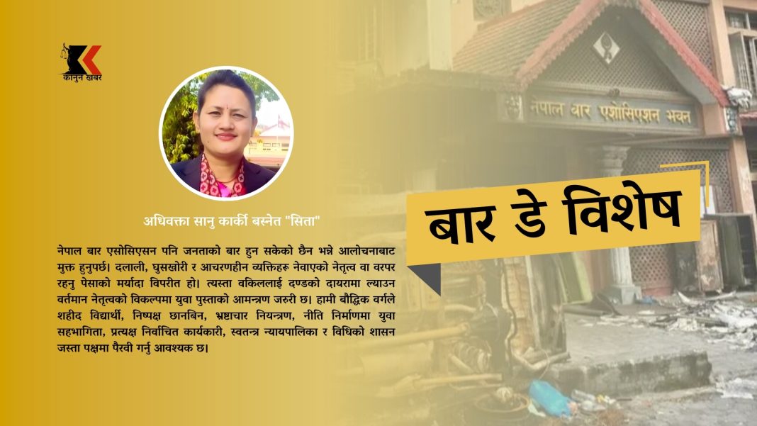 नेपाल बार एसोसिएसन पनि जनताको बार हुन सकेको छैन भन्ने आलोचनाबाट मुक्त हुनुपर्छ। दलाली, घुसखोरी र आचरणहीन व्यक्तिहरू नेवाएको नेतृत्व वा वरपर रहनु पेसाको मर्यादा विपरीत हो। त्यस्ता वकिललाई दण्डको दायरामा ल्याउन वर्तमान नेतृत्वको विकल्पमा युवा पुस्ताको आमन्त्रण जरुरी छ। हामी बौद्धिक वर्गले शहीद विद्यार्थी, निष्पक्ष छानबिन, भ्रष्टाचार नियन्त्रण, नीति निर्माणमा युवा सहभागिता, प्रत्यक्ष निर्वाचित कार्यकारी, स्वतन्त्र न्यायपालिका र विधिको शासन जस्ता पक्षमा पैरवी गर्नु आवश्यक छ। संघीय संरचनामा मुलुक गएको १० वर्ष बित्दा पनि न्यायपालिका र नेवाएको संरचना केन्द्रिकृत नै छ। अब प्रदेश तहमा समेत अधिकार र शक्ति बाँडफाँड हुनुपर्छ। अन्त्यमा, राजनीतिक दल र नेवाए दुवैको नेतृत्वमा पुस्तान्तरण हुनुपर्दछ। जेन-जी पुस्ताको नेतृत्वलाई विकल्पका रूपमा ल्याई रूपान्तरण भएमा मात्र नेपाल बार एसोसिएसन दिवस (बार डे) सार्थक ठहर्छ।